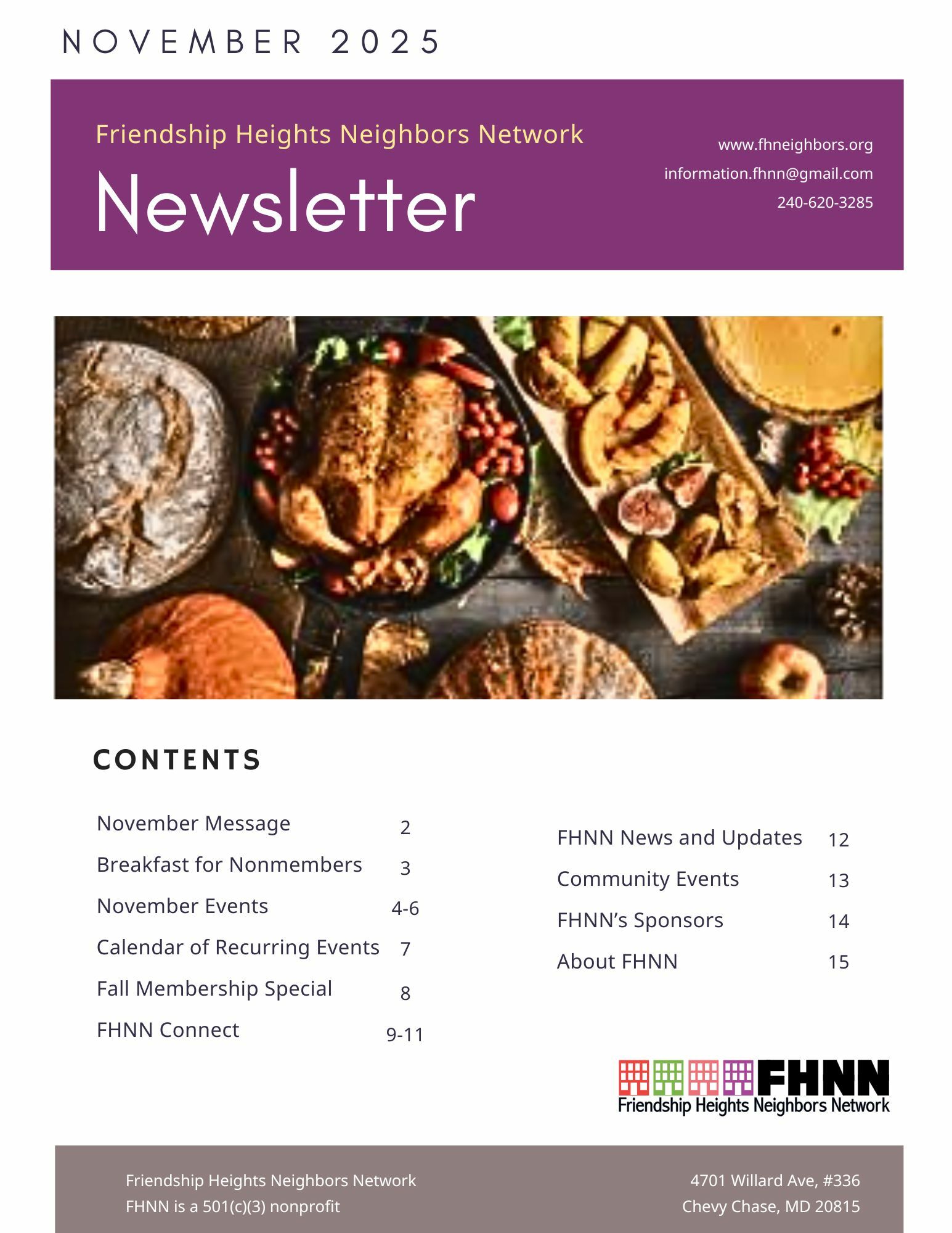 FHNN is a nonprofit, volunteer organization dedicated to the well-being of seniors living in and around Friendship Heights, MD. Our mission is to enable seniors to age in place and remain active in their community.